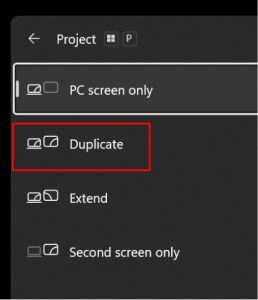 - It should connect automatically, but if it doesn’t, press the display button which is to the right of the ESC key on the keyboard. A window will come up, select duplicate: